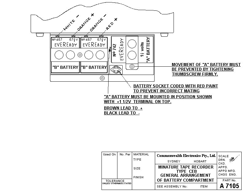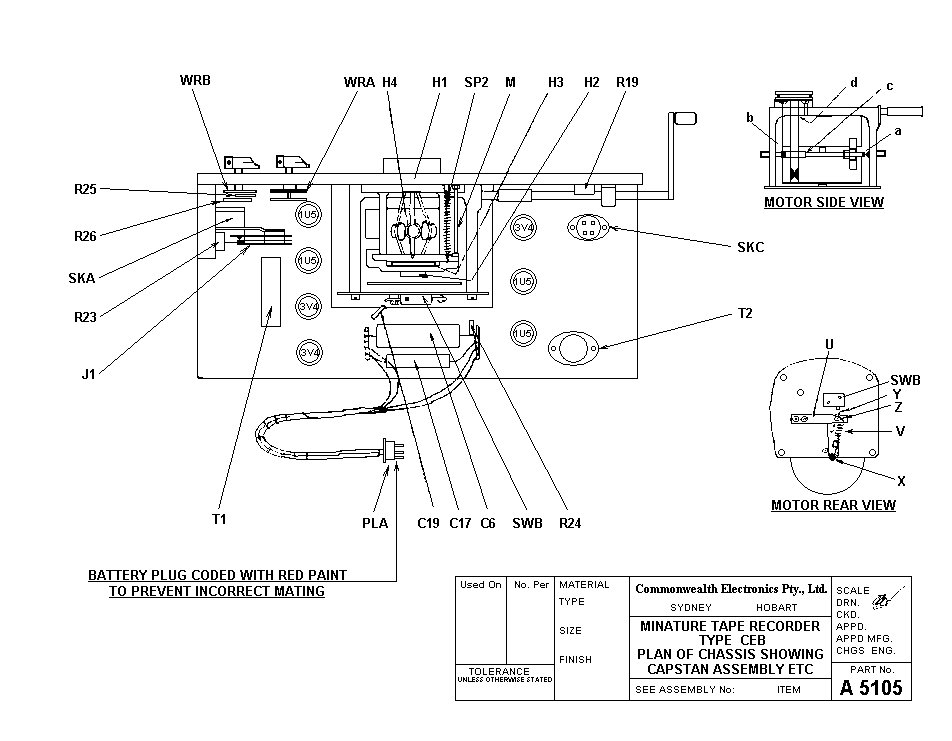 In many types of modern battery operated electronic equipment there is some form of low battery indication, the CEB also has a low energy indicator. Switch SWB shown in the schematic CD1105 and in the rear view of the motor in drawing A5105 was used to trigger an alarm indicating that the motor spring needs winding.