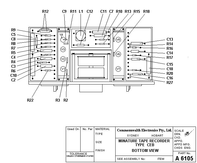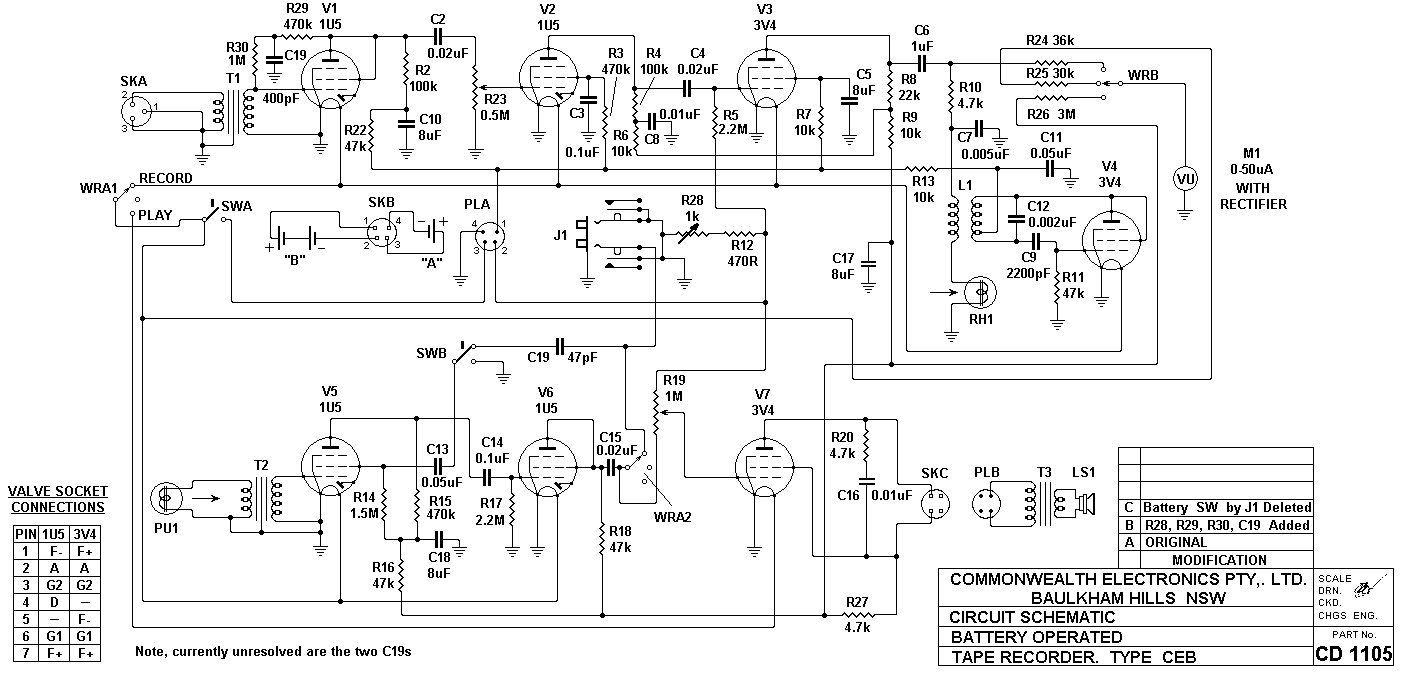 From the information I have there were seven tubes in the unit, 4 x 1U5 and 3 x 3V4. The heads where one of the first to use ferrite material, the use of ferrite particularly for the record head helped to reduce the power requirements of the bias oscillator. After some effort the designers were able to make the unit operate from two standard 67 1/2V HT batteries with discharge at a rate which was not unacceptably high. To reduce the battery consumption the filaments were switched off in the tubes which were not required for a particular mode.